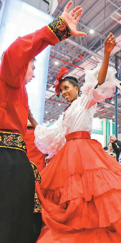 11月8日,一名多米尼加舞者(红裙者)和一名俄罗斯舞者在进博会展馆内起舞。