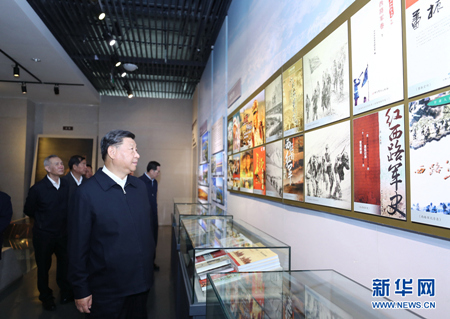 5月20日至22日,中共中央总书记、国家主席、中央军委主席习近平在江西考察,主持召开推动中部地区崛起工作座谈会并发表重要讲话。这是习近平在赣州市于都县中央红军长征出发纪念馆参观,听取有关中央红军长征集结出发历史情况介绍。 新华社记者 谢环驰 摄