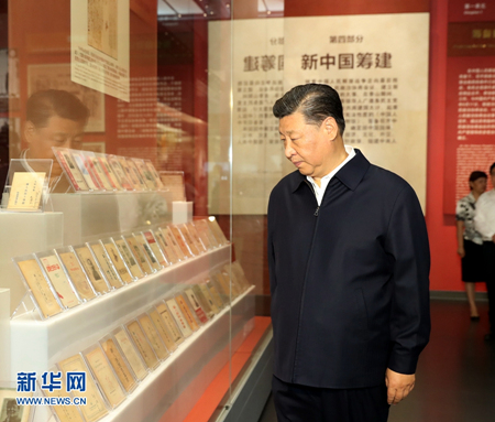9月12日,中共中央总书记、国家主席、中央军委主席习近平视察中共中央北京香山革命纪念地。这是习近平在香山革命纪念馆参观《为新中国奠基》主题展览。 新华社记者 黄敬文 摄