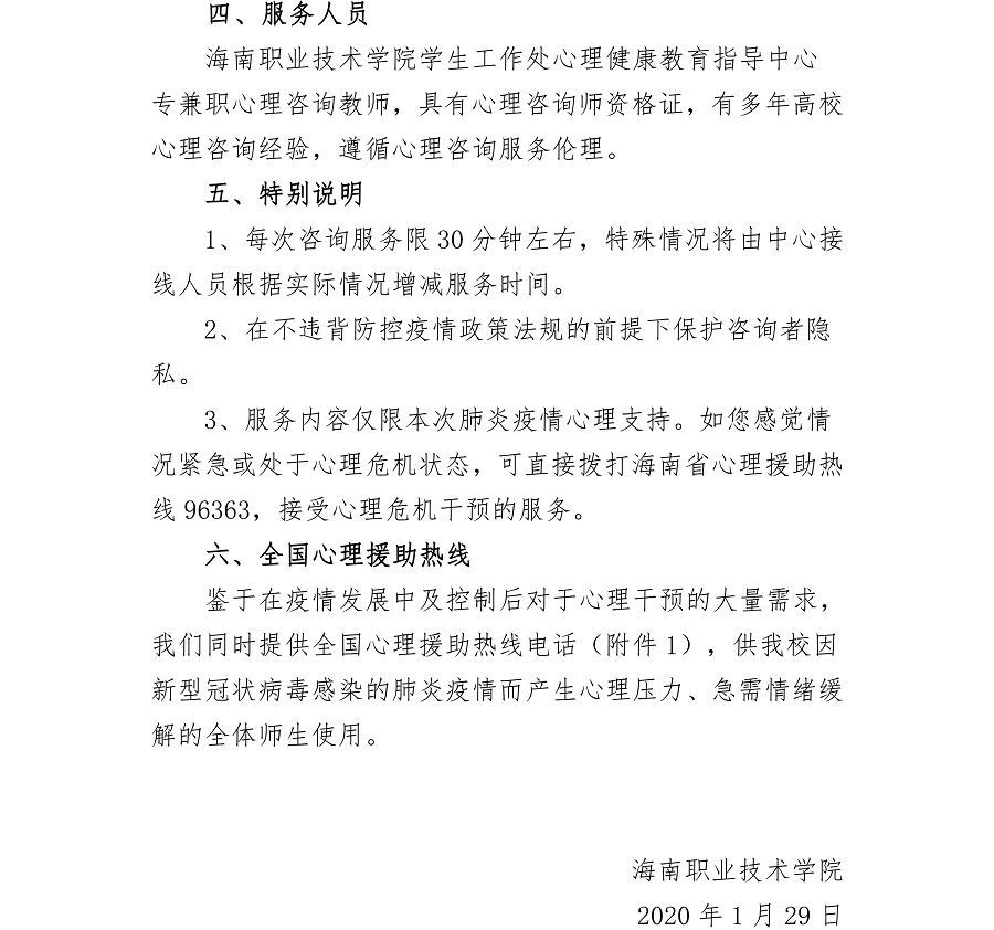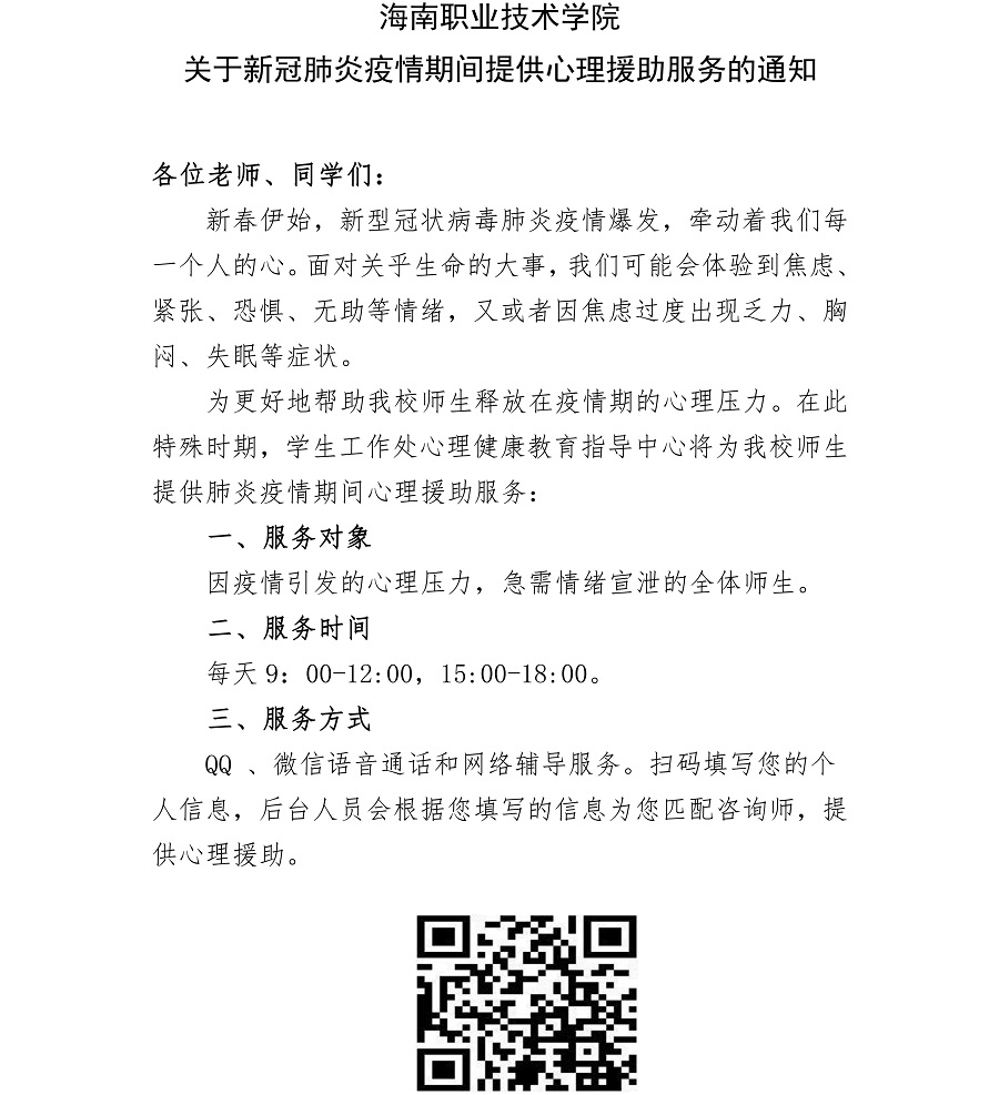 海南职业技术学院关于新冠肺炎疫情期间提供心理援助服务的通知