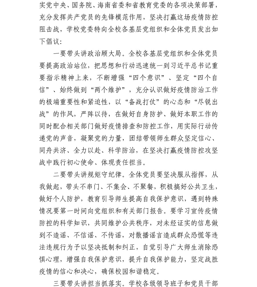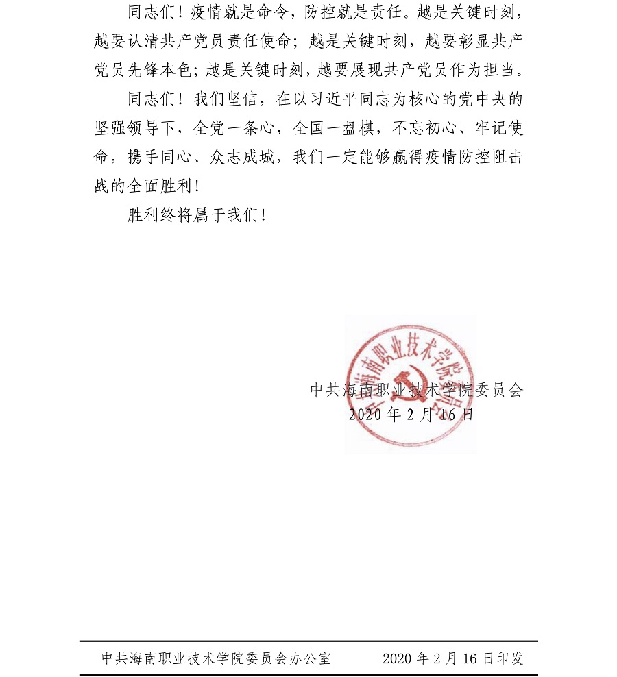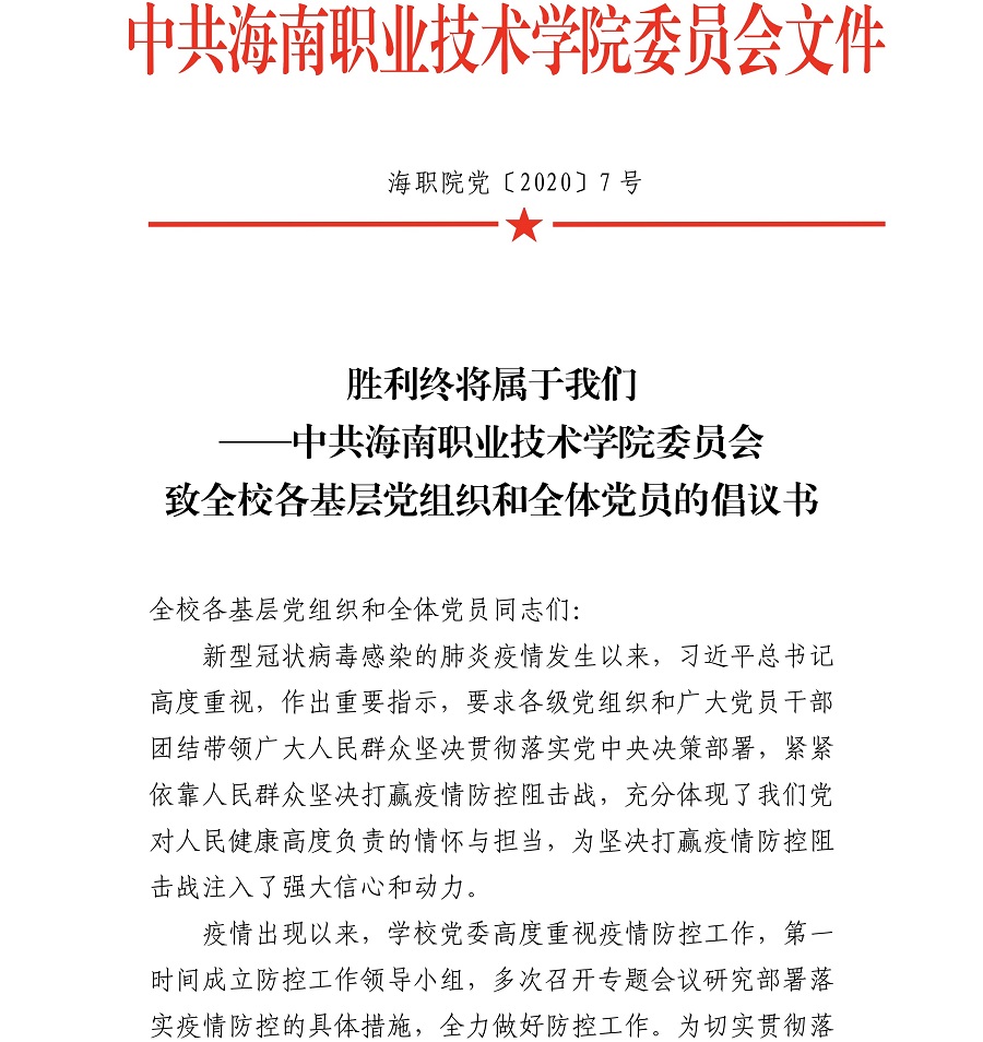 胜利终将属于我们——中共海南职业技术学院委员会致全校各基层党组织和全体党员的倡议书