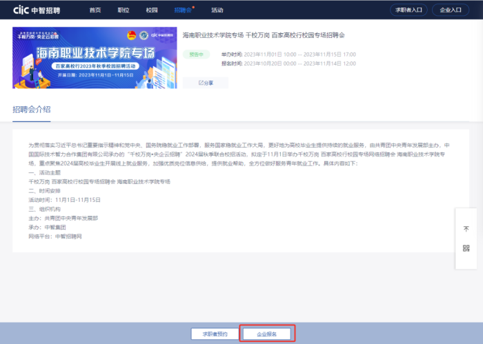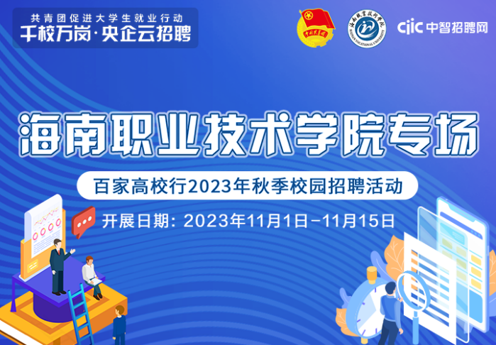 为贯彻落实习近平总书记重要指示精神和党中央、国务院稳就业工作部署,服务国家稳就业工作大局,更好地为高校毕业生提供持续的就业服务,由共青团中央青年发展部、海南职业技术学院主办,中国国际技术智力合作集团有限公司承办开展“千校万岗•央企云招聘”2024届秋季联合校招活动,定于11月1日举办千校万岗 百家高校行校园专场网络招聘会 海南职业技术学院专场,重点聚焦2024届高校毕业生开展线上就业服务,加强优质岗位信息供给,提供就业帮助,全方位做好服务青年就业工作。