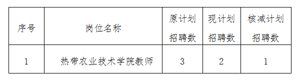 依据《海南职业技术学院2023年第二次公开招聘工作人员公告(第1号)》,考试招聘岗位的招聘人数与应聘该岗位经资格审查符合条件的人数必须达到1:3(含3)的比例才能开考,目前有个别招聘岗位的计划招聘数未达到全部开考比例要求,应按规定进行核减,具体情况如下: