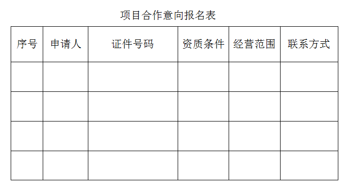 5.相关条件适合的、有意向的,可先到本公司报名填表,经出标方考证、核查后挑选合适人选参加合作项目竞标。(竞标按照公司的相关程序实施,具体情况另行通知)。