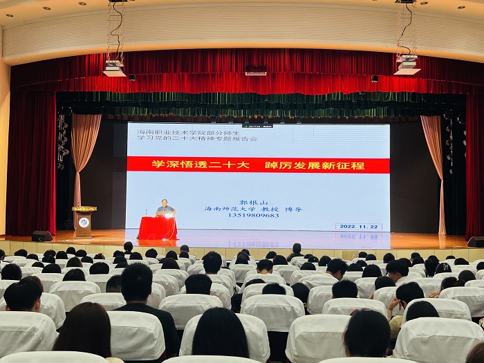为深入推进党的二十大精神进校园进课堂进头脑,我校思想政治教学部于11月23日起举行思政大讲坛系列讲座。首讲邀请了海南师范大学教授、博士生导师郭根山,作主题为《学深悟透二十大  踔厉发展新征程》的讲座。