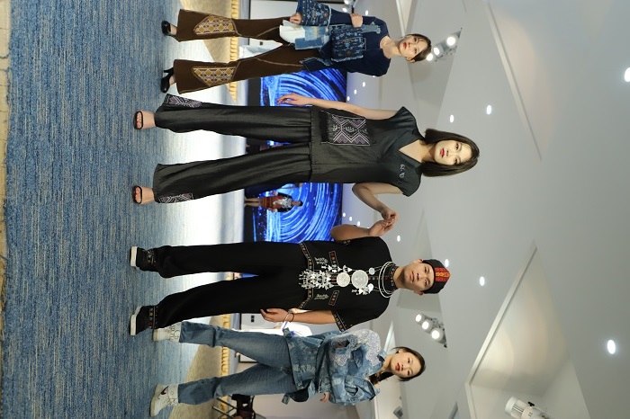 研修期间,学员共完成由5个主题组成的41件黎锦文创作品,作品在结业典礼现场通过模特走秀的方式进行展示。本次研修不仅是专家向传承人传授知识及技艺的课堂,同时也是海南省五大黎族方言区的传承人及其弟子充分开展织锦技艺交流的平台。