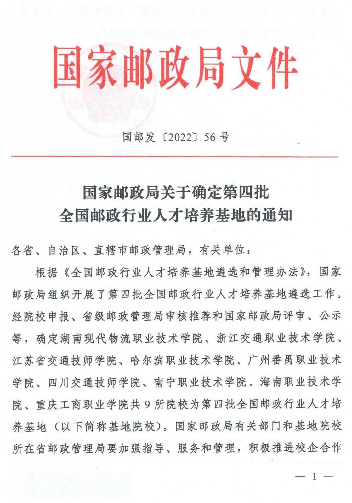 日前,国家邮政局发布《关于确定第四批全国邮政行业人才培养基地的通知》,我校被评为第四批全国邮政行业人才培养基地。
