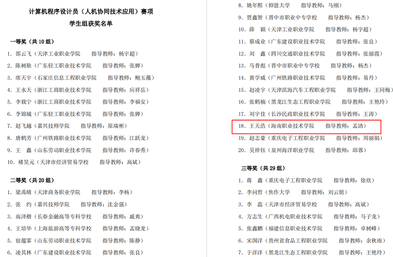 近日,由人力资源社会保障部组织开展的2022年全国行业职业技能竞赛——全国电子企业职业技能竞赛(国家二类赛)公布获奖名单,我校工业与信息学院学生王天浩荣获计算机程序设计员(人机协同技术应用)赛项学生组全国二等奖。