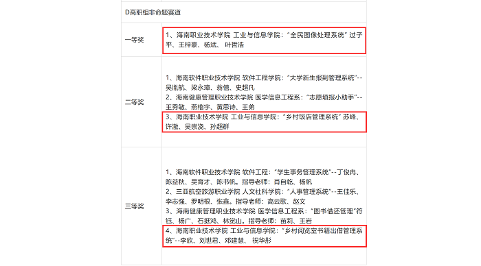2023年3月12日,首届“久其女娲杯”海南省大学生低代码编程大赛决赛在琼海举行。经过激烈的竞争,我校工业与信息学院学子斩获高职组非命题赛道一等奖、二等奖、三等奖各1项。