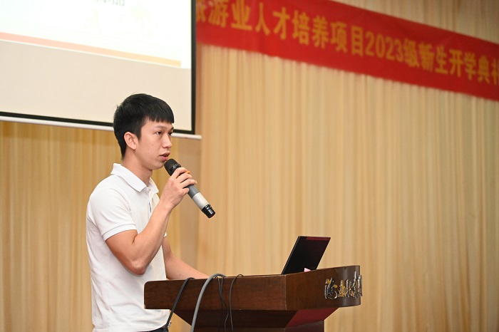 沈振国在讲话中向“旺工淡学”旅游业人才2023级818名新生表示祝贺与欢迎,并详细介绍了海南职业技术学院和“旺工淡学”旅游业人才培养项目,勉励同学们在海职院求学期间热爱生活、勇于探索、持之以恒、敢于创新。