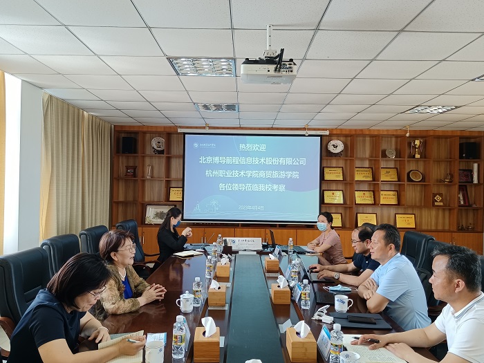 4月4日上午,北京博导前程信息技术股份有限公司董事长段建、副总裁秦刚强和杭州职业技术学院商贸旅游学院院长张赵根一行来校交流考察。学校副校长李琳娜出席座谈会。