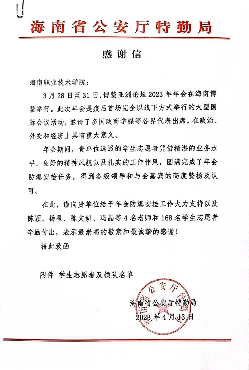 近日,我校收到来自海南省公安厅特勤局、海南省酒店与餐饮协会发来的感谢信。两家单位在信中分别对学校旅游学院民航专业、烹饪工艺与营养等专业学生在博鳌亚洲论坛2023年年会和消博会椰香四海琼菜精品推介暨琼粤港澳名企名厨交流活动中的优异表现给予了高度评价,对学校为社会培养了高素质技术技能人才和各项工作的支持表示了由衷的感谢。