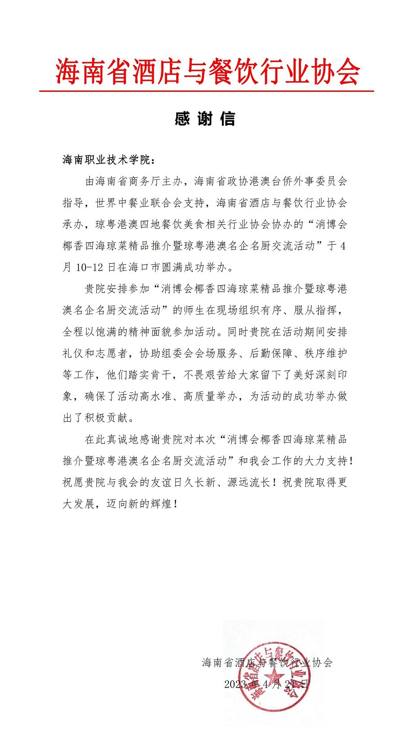 海南省酒店与餐饮协会感谢信(旅游学院供图)