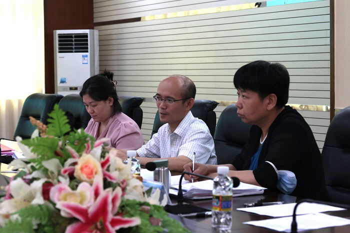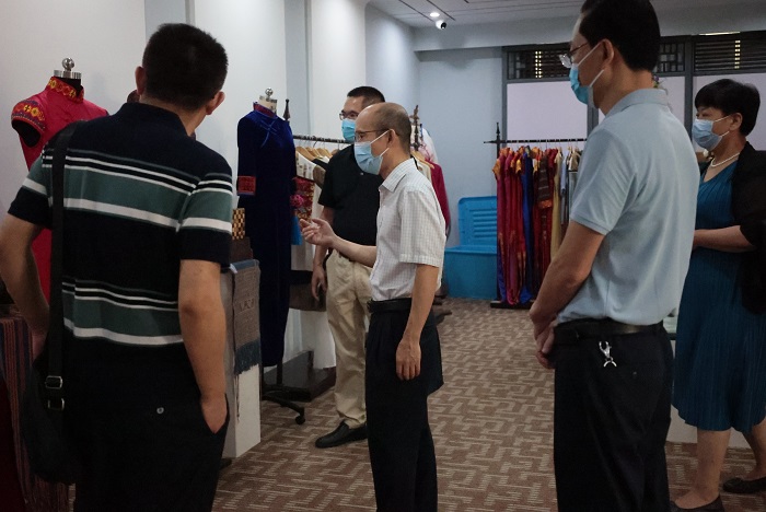 座谈会前,丰圣少一行还参观了我校黎锦展览馆。丰局长对我校少数民族特色文化人才培养工作给予了充分的肯定,并提出依托线上平台开展定制化营销的建议,为向中外宣传海南省黎锦产品与文化贡献海职力量。