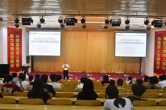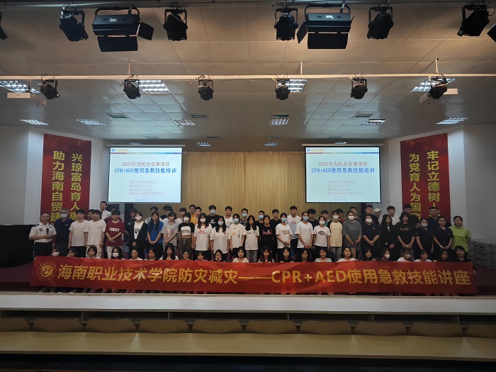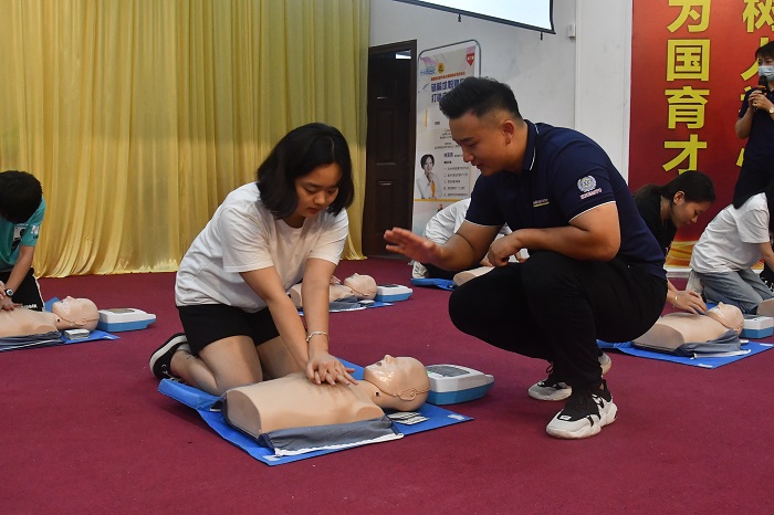 为进一步普及在校学生的应急救护知识,学习掌握急救操作技能,提高安全防范意识,增强自救互救,5月12日下午,我校联合海口市120急救中心、??谑泻焓只?、海南省急救医学培训中心开展CPR+AED使用急救技能培训。
