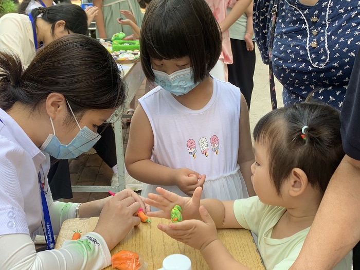 社区幼儿在学生引导下体验黏土造型制作(艺术学院供图)