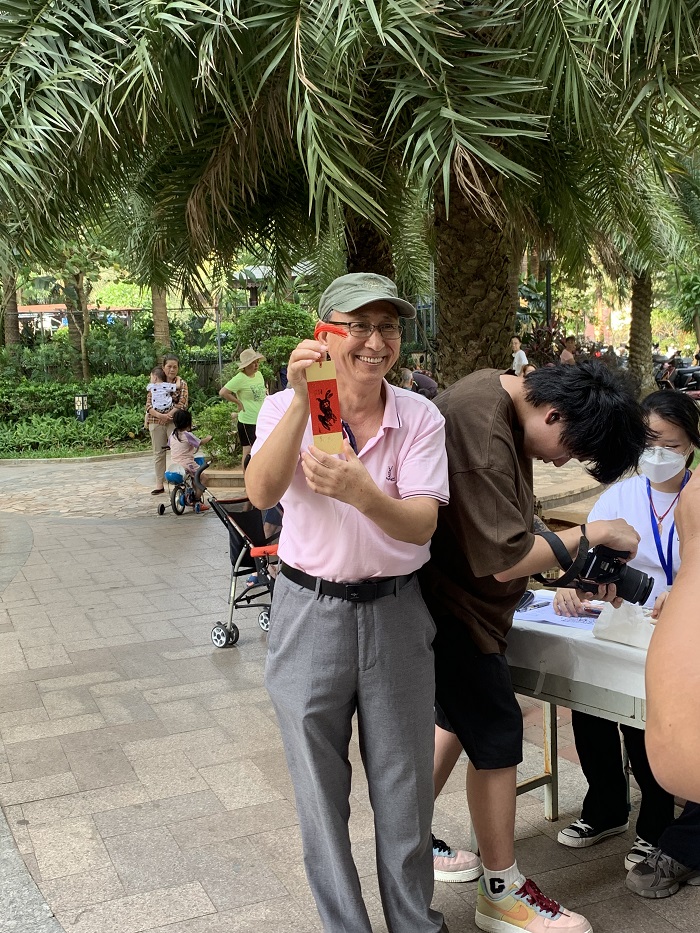 社区老人体验并展示版画生肖兔书签(艺术学院供图)