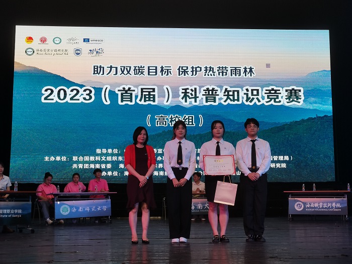 5月22日,由海南省林业局 (海南热带雨林国家公园管理局 )、共青团海南省委、海南省文学艺术联合会、五指山市政府、联合国教科文组织 (UNESCO) 驻华代表处、海南国家公园研究院联合主办的2023年(首届)“助力双碳目标,?;と却炅?rdquo;科普知识竞赛决赛在海南大学举行,经过激烈的角逐,我校代表队荣获高校组三等奖。