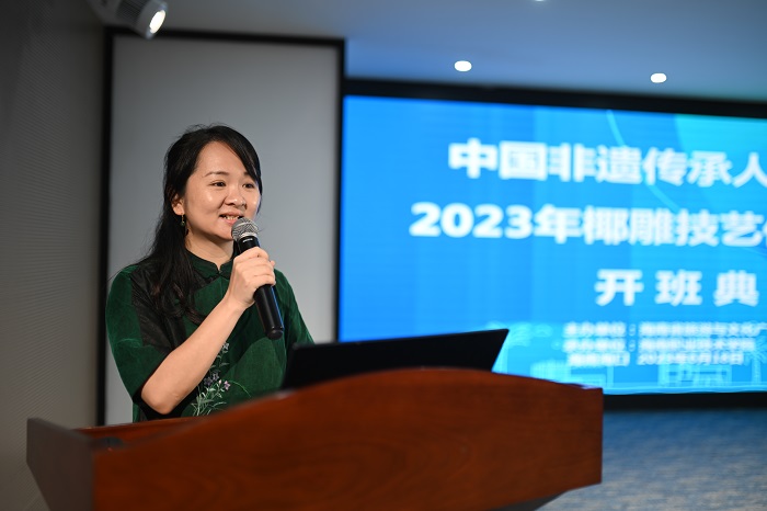 由国家文化和旅游部、教育部、人力资源和社会保障部联合实施,海南省旅游和文化广电体育厅指导,海南职业技术学院主办的“中国非遗传承人研培计划—2023年椰雕技艺传承培训班”于2023年6月18日开班。海南省旅游和文化广电体育厅公共文化处(非遗处)副处长陈虹霓,海南职业技术学院副校长李琳娜出席开班典礼。