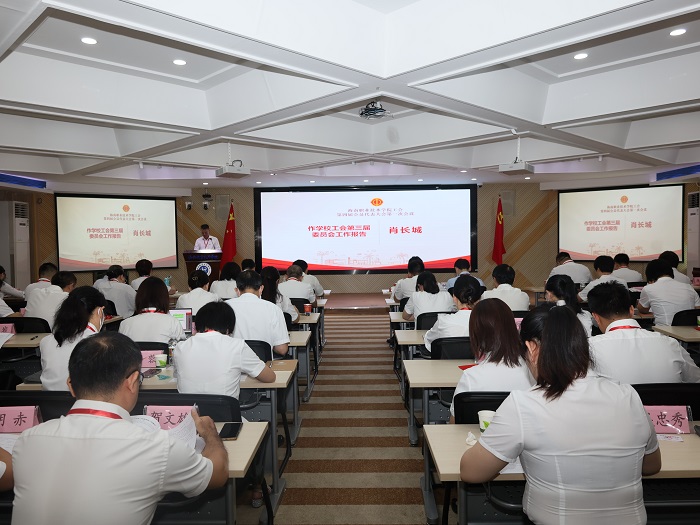 校工会负责人肖长城作了题为《高举习近平新时代中国特色社会主义思想伟大旗帜,团结动员教职工为创建本科层次职业学校努力奋斗》的报告?!侗ǜ妗纷芙崃私昀囱9せ嵛被嵩谡卫砺垩啊⒚裰鹘ㄉ韫芾砉ぷ?、教职工权益保障工作、教职工问题组织工作等方面取得的创新成就,并对今后的工作提出建议。