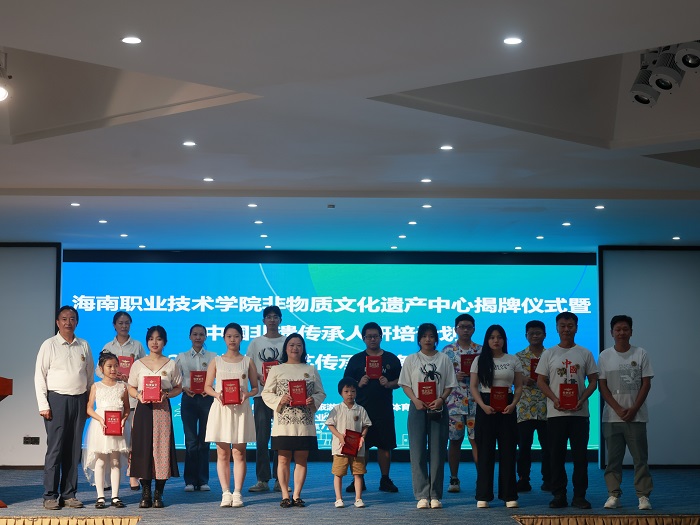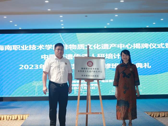 结业班上,陈虹霓和许昌斌为海南职业技术学院非物质文化遗产研究中心传承教育实践基地揭牌。