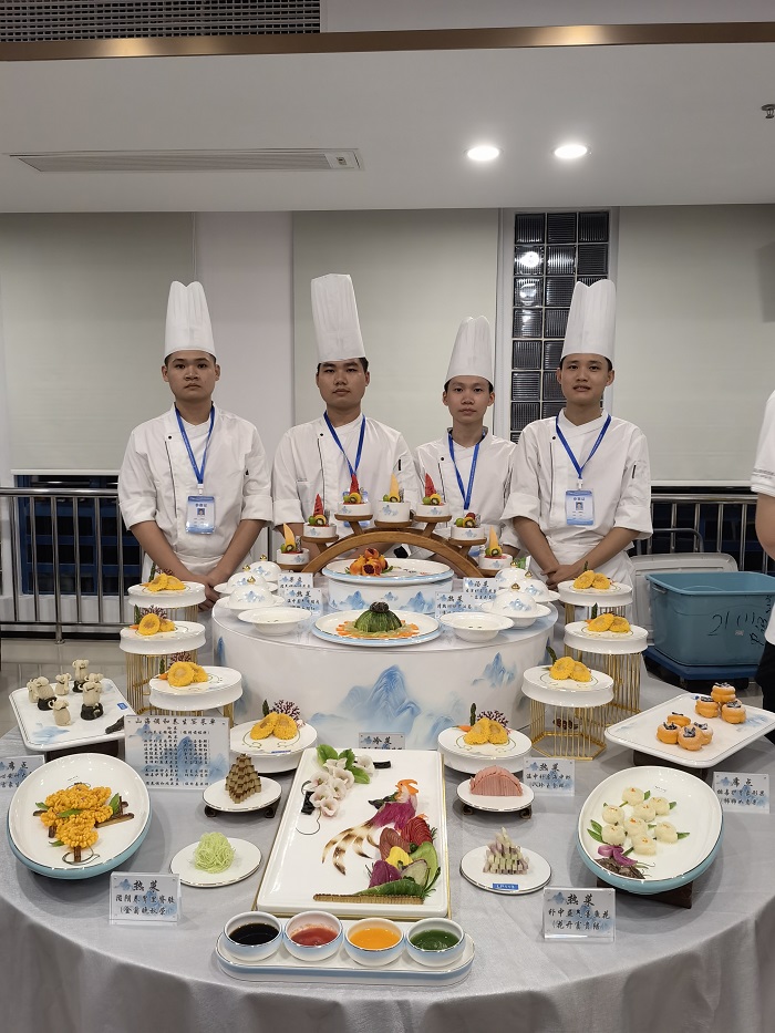 2023年全国职业院校技能大赛高职组烹饪赛项于7月27日-31日在广州顺德隆重举行。我校烹调工艺与营养专业学生谢锡威、梁茂林、叶秀彦、朱德振组成的参赛团队在林书芳、廖秀奇老师的指导下参加比赛。