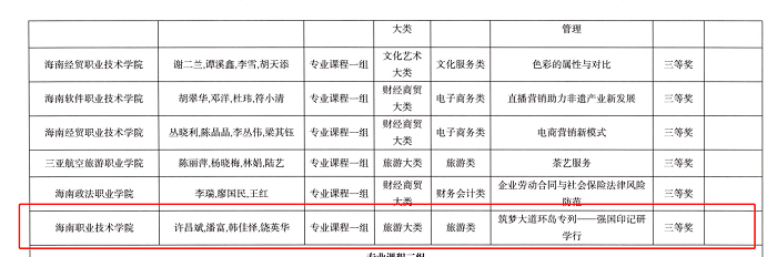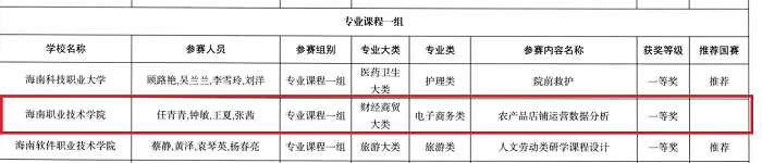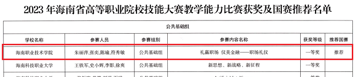 近日,海南省教育厅公布了2023年海南省高等职业院校技能大赛教学能力比赛决赛结果,海职院参赛教师团队从激烈的竞争中脱颖而出,共获得一等奖2项,三等奖3项。其中,通识教育学院朱丽萍团队一举斩获公共基础组一等奖第一名,创造了海职院教师团队省赛历史最好成绩。