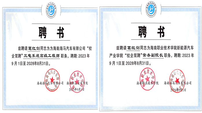 经校企双方单位和参与“岗课赛证”教学的学生推荐,学校决定聘任海南海马汽车有限公司项目管理组组长刘钢等11位同志为第一批我校新能源汽车产业学院“岗课赛证”教学“双岗双聘”教师,海南海马汽车有限公司决定聘任我校葛红剑等9位教师为公司汽车生产制造部一线工程师,聘期为5年。