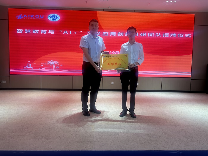 孟清向王建朝授“智慧教育与“AI+”交叉应用创新科研团队合作单位”牌匾(海职院供图)
