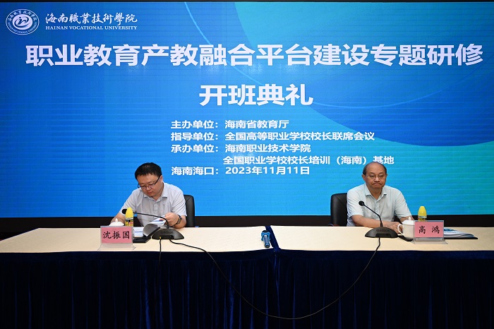 11月11日,由海南省教育厅主办、全国高等职业学校校长联席会议指导、海南职业技术学院承办的职业教育产教融合平台建设专题研修班在??诰傩小A赡≈耙导际踅逃Щ岢N窀被岢じ吆?、海南职业技术学院校长助理沈振国等出席开班典礼,来自省内各高等职业学校的相关领导和骨干教师共310余人参加本次培训。