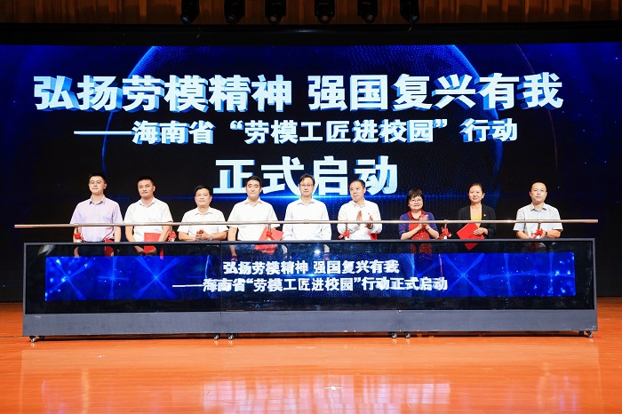 启动仪式上,我校党委委员、副校长、工会主席符兴干致欢迎词。省总工会党组成员、副主席陈波做活动介绍,提出各级工会组织加强与教育部门的协调联动,争取通过五年左右时间,实现 “劳模工匠进校园”行动在全省大中小学全贯通,教育引导学生崇尚劳动、尊重劳动。省教育厅党委委员、副厅长李燕仪做动员讲话,号召全省各大中小学以此为契机,加强劳动教育,组织好形式多样的劳模工匠进校园活动,学习劳模、尊重劳模、争当劳模。同时,活动现场为6为劳模代表颁发了“海南省劳模工匠宣讲团成员聘书”。