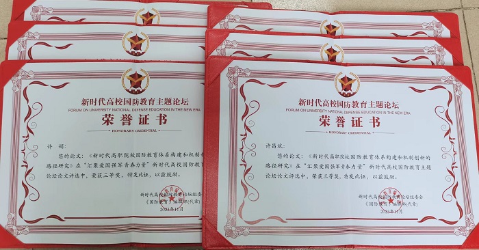 11月8日至11 日,由南开大学和《国防教育》编辑部主办,中国红色文化研究会国防文化专业委员会和北京中关工国防教育咨询中心承办的“汇聚爱国强军青春力量”新时代高校国防教育主题论坛在天津召开。我校许昌斌副教授和许娟老师撰写的3篇论文主题鲜明,论述充分,其中《新时代高职院校国防教育体系构建和机制创新的路径研究》荣获三等奖,《新媒体语境下高校国防教育策略研究》《基于共生理论构建全民国防教育体系的路径研究》荣获优秀奖。