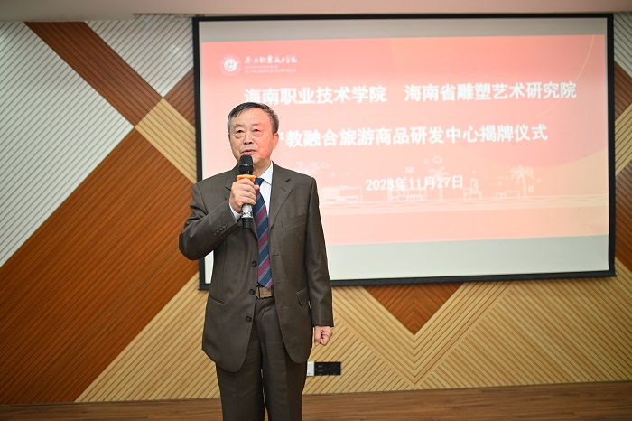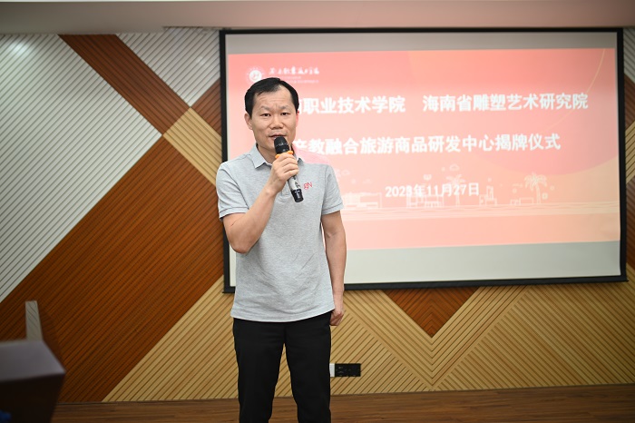 11月27日,产教融合旅游商品研发中心揭牌仪式在海南职业技术学院隆重举行。海南省雕塑艺术研究院院长,著名雕塑大师程连仲、海南文化创意研究院副院长刘晓霞,京润珍珠科技有限公司总经理王海,海南省归创国际文旅投资有限公司陈虎庆和海南职业技术学院校长助理沈振国,学校旅游学院党总支书记符国繁、院长颜燕参加开幕式。
