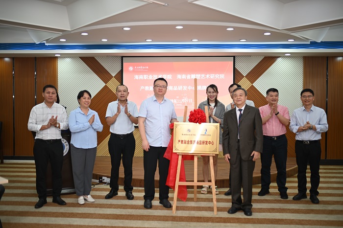 最后,程连仲院长和沈振国助理共同为产教融合旅游商品研发中心揭牌。与会者纷纷表示将以此为契机,进一步加强合作,不断深化产教融合,共同推动旅游商品产业的创新和发展,为海南省的文化创意产业和旅游商品产业的繁荣发展贡献更大力量。
