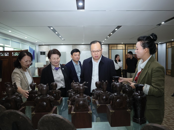 翁波一行参观我校非遗项目椰雕作品(校务办公室供稿)