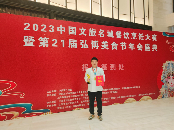 此次比赛为2023年国家级二类技能大赛,大赛共设冷菜、热菜、面点3个赛项,来自全国的200余名精英选手激烈角逐,我校烹饪专业教师廖秀奇凭借扎实的基本功、沉着的临场发挥,最终荣获金奖。