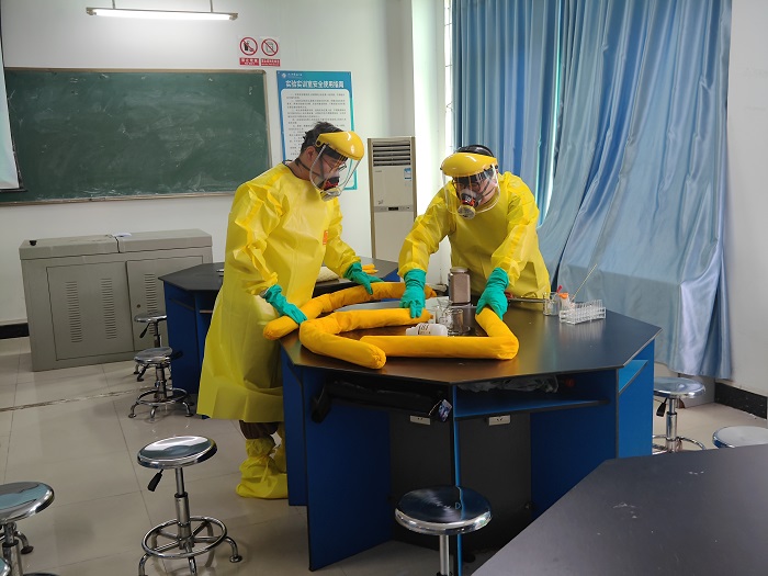 演练由热农学院实验室团队负责实施,模拟了实验室在进行化学实验时,由于操作不当,导致盐酸泄漏并泼洒学生、实验台和地面上,造成实验室人员受伤的情况。整套演练生动的复原了实验室盐酸泄漏突发之后,各职能部门按照学校实验室突发事件应急预案处置流程,协调配合,有序完成人员紧急撤离、现场警戒、盐酸紧急处理、事故报告等环节。