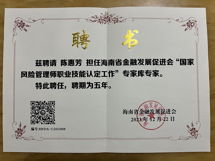 日前,经海南省金融发展促进会择优遴选,我校经济管理学院陈惠芳、彭帆两名老师成功入选为“国家风险管理师职业技能认定工作”专家库的首批核心成员。同时,陈惠芳和彭帆两位老师还成为海南省金融发展促进会的个人会员。