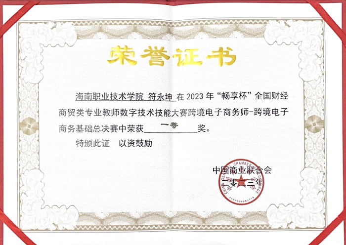 日前,我校经济管理学院跨境电子商务专业教师符永坤荣获2023年“畅享杯”全国财经商贸类专业教师数字技术技能大赛总决赛(跨境电子商务师-跨境电子商务基础赛项)全国一等奖。