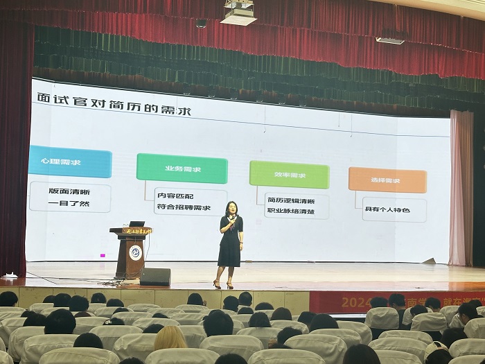 熊老师凭着多年的企业人力资源管理和职业指导经验,先后从当代大学生的择业特点、外部职业环境、简历制作技巧、企业甄别及面试技巧等四个方面与学生进行现场互动,回答学生有关问题,帮助学生学生提高职业生涯规划、求职技巧和自我职业认知能力。