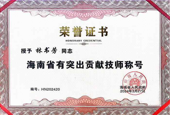 我校林书芳老师荣获“海南省有突出贡献技师”称号