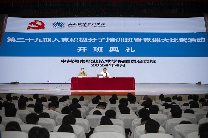 4月7日晚,海职院党校第三十九期入党积极分子培训班暨党课大比武活动开班典礼在学校大礼堂举行。学校党委书记周炳才出席开班仪式并讲授中国式现代化专题思政课。