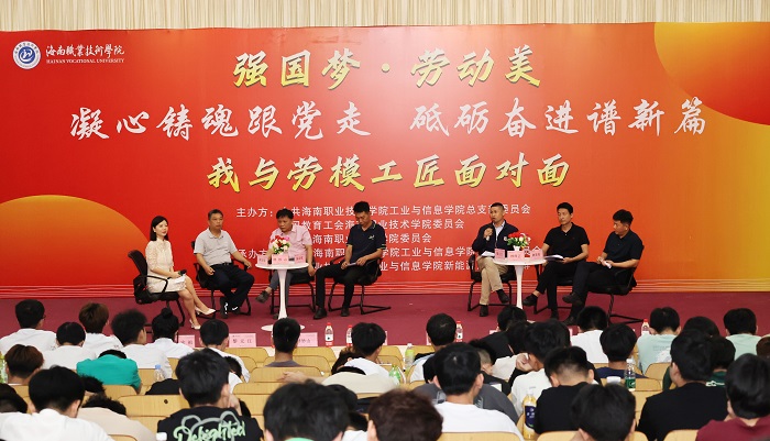 4月26日,由海南职业技术学院工会、团委、工业与信息学院党总支、海南省葛红剑汽车维修工技能大师工作室共同主办的“‘强国梦·劳动美’——凝心铸魂跟党走,砥砺奋进谱新篇——我与劳模工匠面对面”活动在学术报告厅举行。