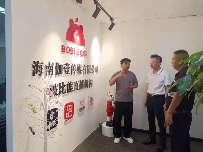 在海南伽壹传媒有限公司,该司总经理林道龙是我校乡村振兴学院学生。他对校领导的到访表示欢迎,并引领周炳才一行参观了公司的直播间、录播室等工作场所。周炳才对林道龙创业表示祝贺,希望学生加强与学校联系与交流,也能经?;匦7窒砭?。林道龙表示会加强与学校的联系,把企业办好,为校争光。