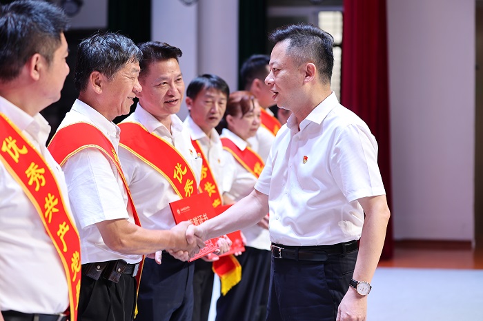 周炳才为荣获“优秀共产党员”称号的党员颁发证书(党委宣传部供图)