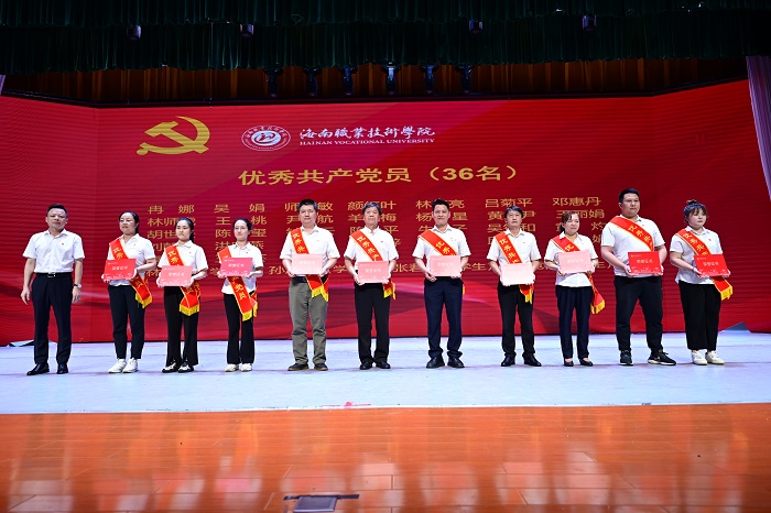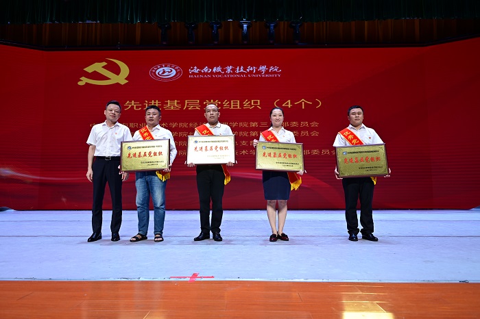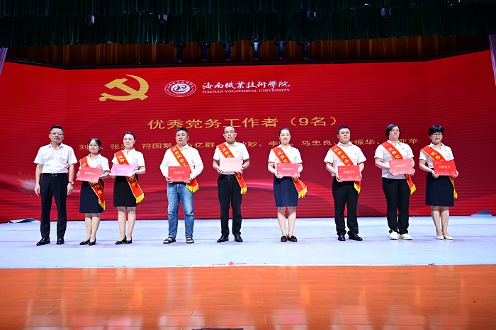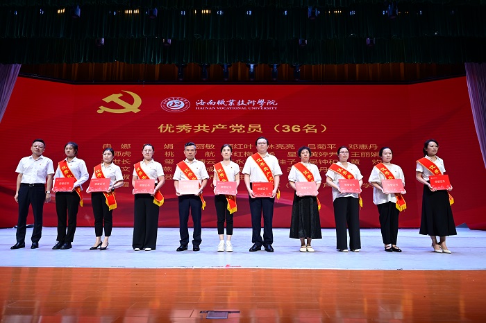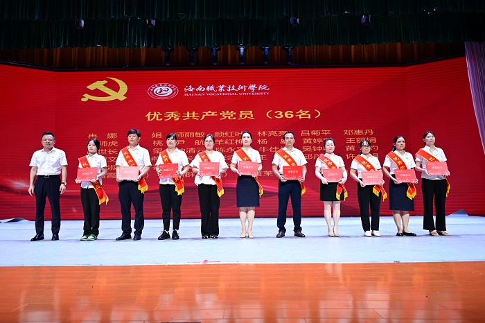 大会上,符兴干宣读了学校优秀共产党员、优秀党务工作者和先进基层党组织表彰文件。周炳才为冉娜等36位获得学校“优秀共产党员”称号的党员、刘炜等9位获得学校“优秀党务工作者”称号的党员、中共海南职业技术学院经济管理学院第三支部委员会等4个获得“先进基层党组织”称号的党组织颁奖。