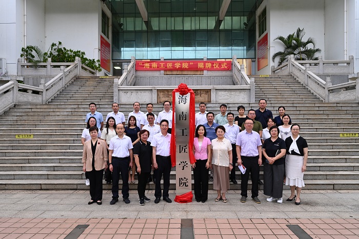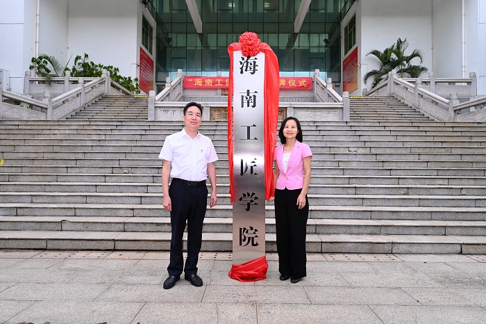 7月18日,海南工匠学院揭牌仪式在海南职业技术学院举行。海南省总工会副主席陈桦、省教科文卫邮电工会负责人孙陶峰、省教育工会专职副主席林洪珊、省总工会经济技术部部长王玉燕,海南职业技术学院党委委员、副校长、校工会主席符兴干和副校长李琳娜等出席揭牌仪式,陈桦和符兴干共同为“海南工匠学院”揭牌。