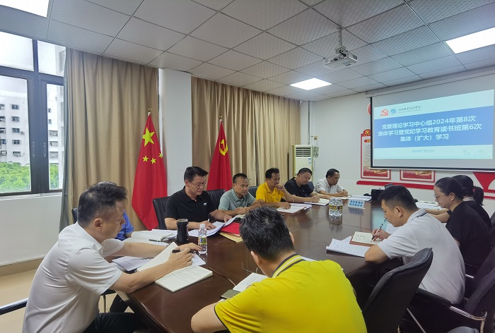 7月23日,海南职业技术学院党委理论学习中心组2024年第8次集体学习暨党纪学习教育读书班第6次集中(扩大)学习在行政楼422党委会议室开展。党委书记周炳才主持学习会,学校党政领导、党委理论学习中心组成员、领导班子读书班成员及各党总支(直属党支部)书记、副书记参加学习。