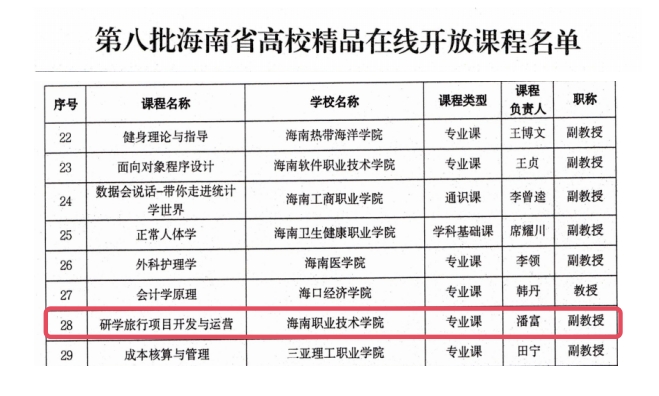 近日,海南省教育厅公布了第八批海南省精品在线开发课程名单,由我校旅游学院潘富副教授负责的《研学旅行项目开发与运营》课程成功获批。