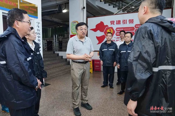 在海南职业技术学院,冯飞步入学生寝室、食堂,看望部分在校学生并检查学校生活物资储备、餐食供应及水电保障等情况,要求全省各类高校严格执行校领导应急值班值守制度,加强台风期间校园安全管理,对所有在校学生开展精准查漏,完善紧急情况下生活保障预案,做好在校师生心理疏导工作,共同守护校园安全稳定。